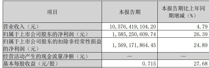 归属于上市公司股东的净利润15.85亿元,